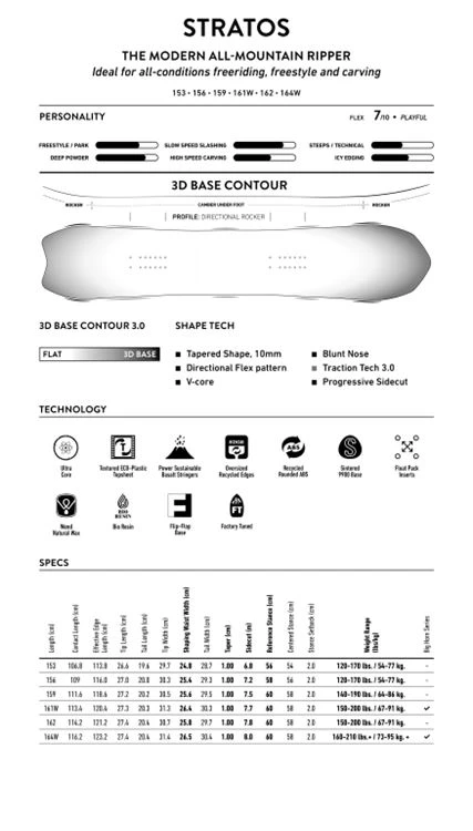 De Stratos is een hybride all-mountain board met de body van een directioneel freeride board en de spirit van een freestyle board. De Stratos heeft een speels boardgevoel dankzij een smalle sidecut en vriendelijke flex, maar de 10 mm taper en 3D Contour Base 3.0 geven hem de float en turn performance van een pow board. Het directionele rockerprofiel en Traction Tech 3.0 zorgen ervoor dat de Stratos stevig op zijn kant blijft bij het accelereren in carves, en de getextureerde Eco-plastic topsheet en Basalt stringers zorgen voor torsierespons en verminderen board chatter in ruw terrein. De Stratos heeft ook Float Pack inserts die een setback stance optie bieden voor de diepste dagen.